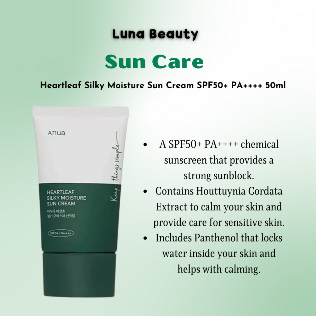 Anua Heartleaf Silky Moisture Sun Cream, your year-round companion for radiant, protected, and beautifully moisturized skin. This exceptional sun cream boasts a unique formula that seamlessly adheres to your skin, leaving it silky smooth without any uncomfortable heaviness or cloudiness. Say goodbye to that greasy sunscreen feel and embrace a product that's perfect for use 365 days a year.