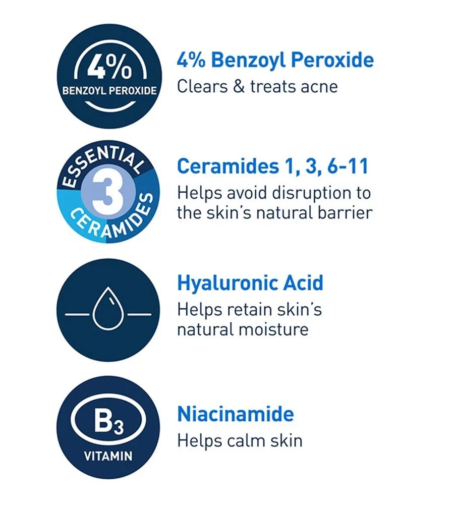 CeraVe is the #1 dermatologist-recommended cleanser brand for acne*, and our first acne-treatment product with 4% benzoyl peroxide is backed by well-established skincare knowledge and expertise. The new CeraVe Acne Foaming Cream Cleanser is formulated to thoroughly dissolve dirt and excess oil, while clearing acne with 4% benzoyl peroxide. Our formula also features hyaluronic acid to help retain your skin’s natural moisture and niacinamide to provide you with soothing benefits, while allowing your skin to heal.