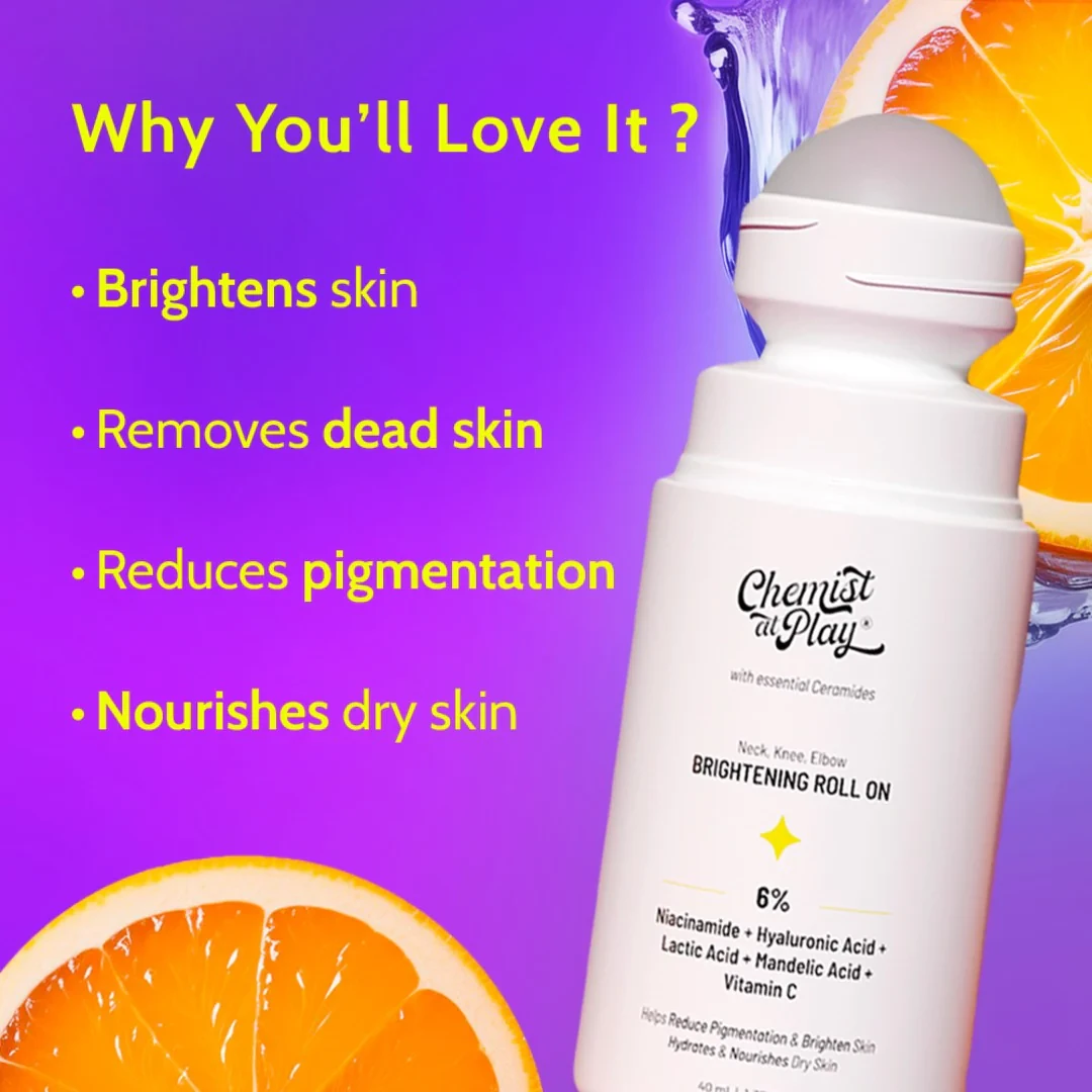 Tired of dealing with dark neck, elbows, and knees? Say hello to the Chemist At Play Neck Knee & Elbow Brightening Roll On, a quick-absorbing and fuss-free solution that exfoliates, brightens and nourishes your skin. Whether it’s neck pigmentation, elbow darkness removal or knee pigmentation, this roll on targets stubborn spots with skin-loving actives like Mandelic Acid, Niacinamide, Vitamin C and Ceramides. It works on all skin types, helps restore even tone and keeps rough patches hydrated and smooth.