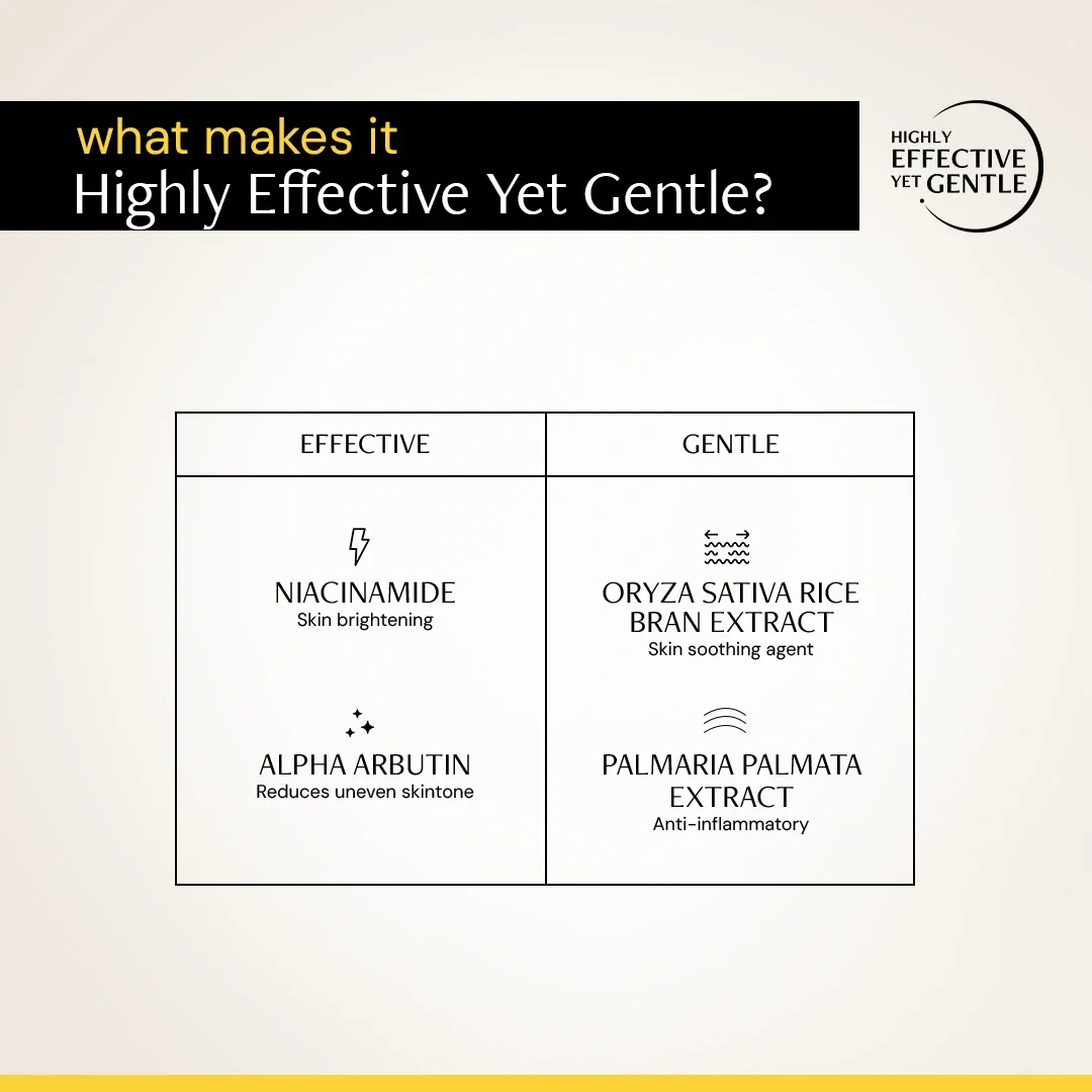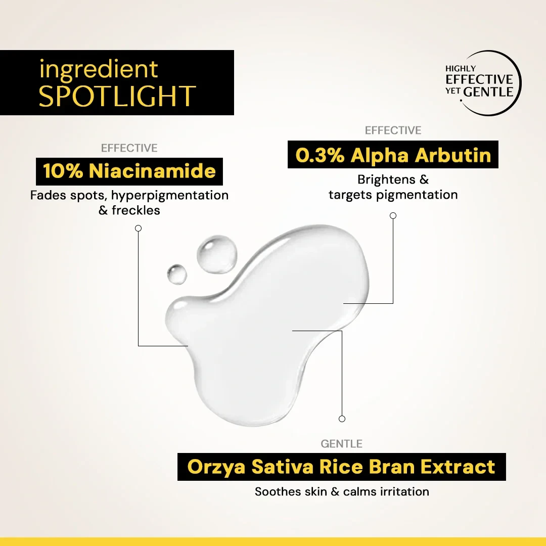 Power Combo: The combination of 10% niacinamide and 0.3% Alpha Arbutin brightens the face while still being gentle.