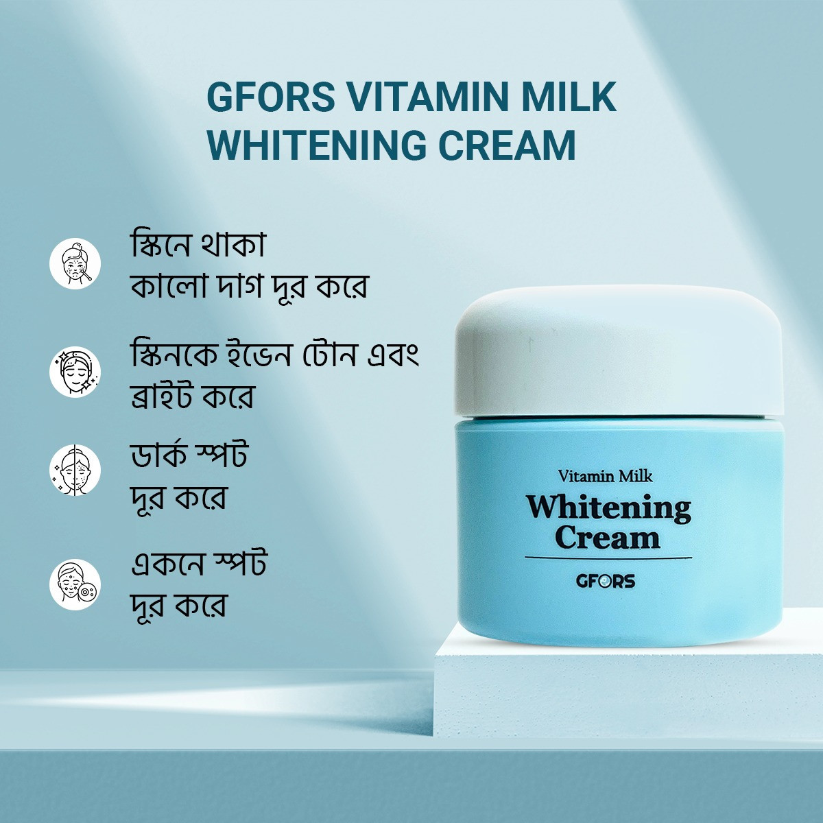 GFORS VITAMIN MILK WHITENING CREAM is a skin-brightening cream that actively helps improve the appearance of dull skin for a radiant complexion. Infused with vitamin extract and milk protein extract to brighten skin tone.