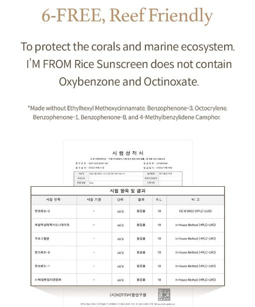 The Korean sunscreen contains Non-nano Zinc Oxide is physical (mineral) sunscreen filter, and so that can block both UVA and UVB and is less likely to penetrate human skin causing irritation, thereby suitable for young children. The product keeps the skin safe and relaxed by instantly reflecting UV radiation so that it does not penetrate the skin. It also has an excellent effect in soothing and protecting the skin, and thus quickly calms the skin that is irritated by UV radiation. The I'm From Rice Sunscreen does not contain Oxybenzone and Octinoxate and is a reef-friendly formulation.