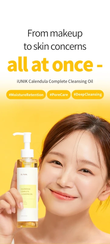 The iUNIK Calendula Complete Cleansing Oil is a quick and easy, all-in-one cleanser that gently removes makeup and sunscreen without drying your skin. Formulated with only 6 natural plant oils (Sunflower Seed Oil, Canola Oil, Calendula Flower Extract, Jojoba Seed Oil, Macadamia Seed Oil and Cananga Odorata Flower Oil) to nourish, soothe and hydrate, this lightweight first cleanser effectively deep cleanses your skin to remove blackheads, excess oil and other impurities from your pores.