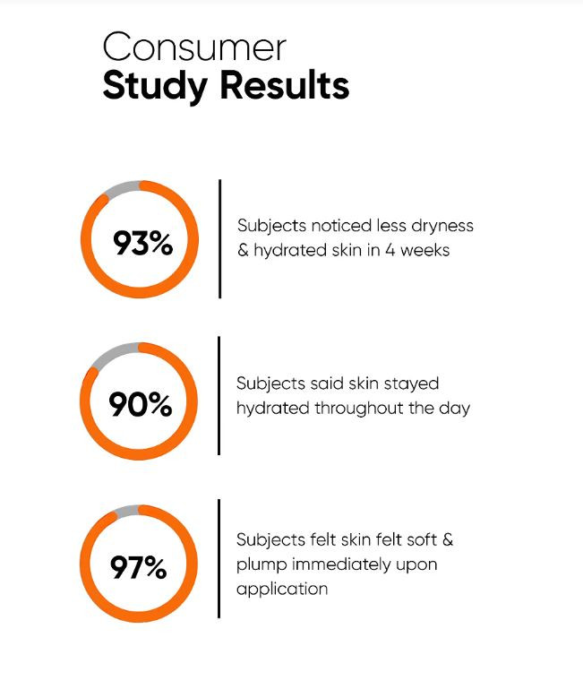 Hyaluronic Acid & Polyglutamic Acid are potent hydrators & we got the product's efficacy evaluated through a consumer study.