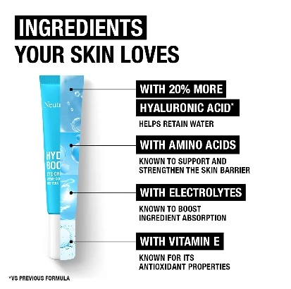 The Neutrogena® Hydro Boost Eye Cream is designed to provide a refreshing shot of hydration to the eye contour and help strengthen the delicate eye skin’s moisture barrier.