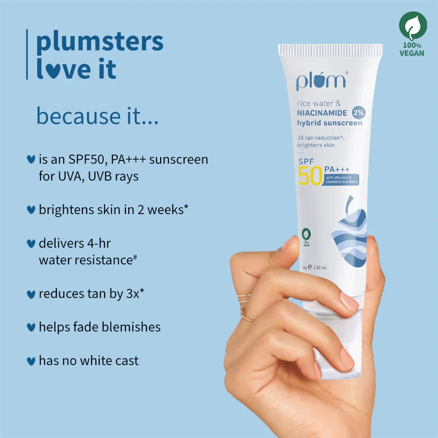 Tags: Plum 2% Niacinamide & Rice Water Hybrid Face Sunscreen With SPF 50 PA+++, Plum 2% Niacinamide & Rice Water Hybrid Face Sunscreen, Plum 2% Niacinamide & Rice Water sunscreen, Plum 2% Niacinamide sunscreen, Rice Water sunscreen, plum Sunscreen, brightening sunscreen, sunscreen