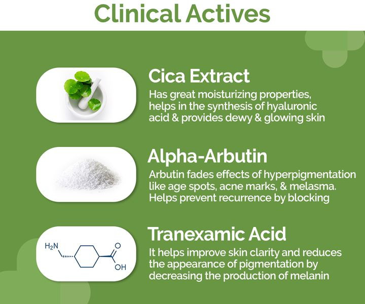 -*The fantastic dream team of Cica, Alpha Arbutin, Tranexamic Acid evens out skin tone & imparts amazing radiance & glow.
