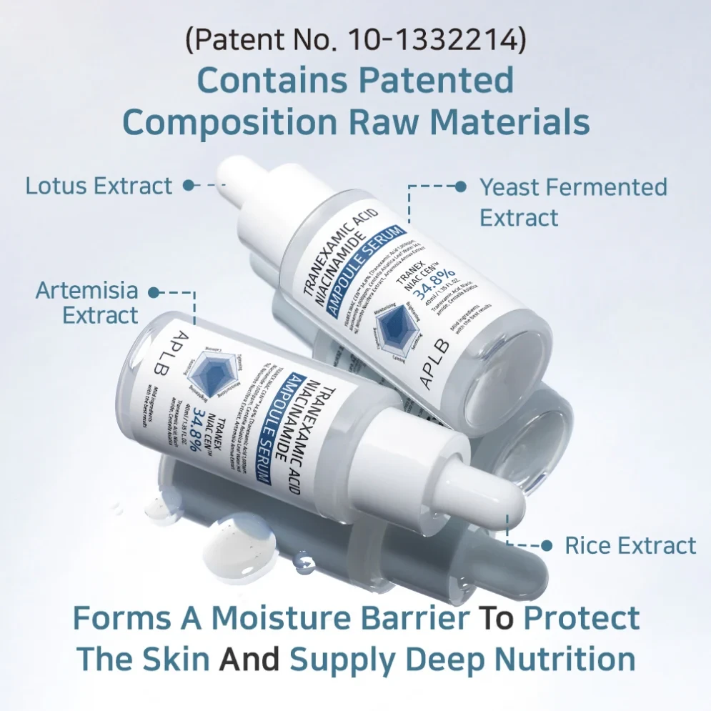 An ampoule contains Tranexamic Acid, Niacinamide, and Centella Asiatica that offers refreshing moisture recharge to dry skin.A method of applying formulation technology that protects retinol ingredients to safely reach the skin and absorb the active ingredients with the APLB’s Formulation Technology Wide-Spread Texture system applied to Ginseng Root Extract Ingredient.Cosmetic ingredient safety grade 1-2.Protects the skin from irritation with weak acidity close to healthy skin pH.