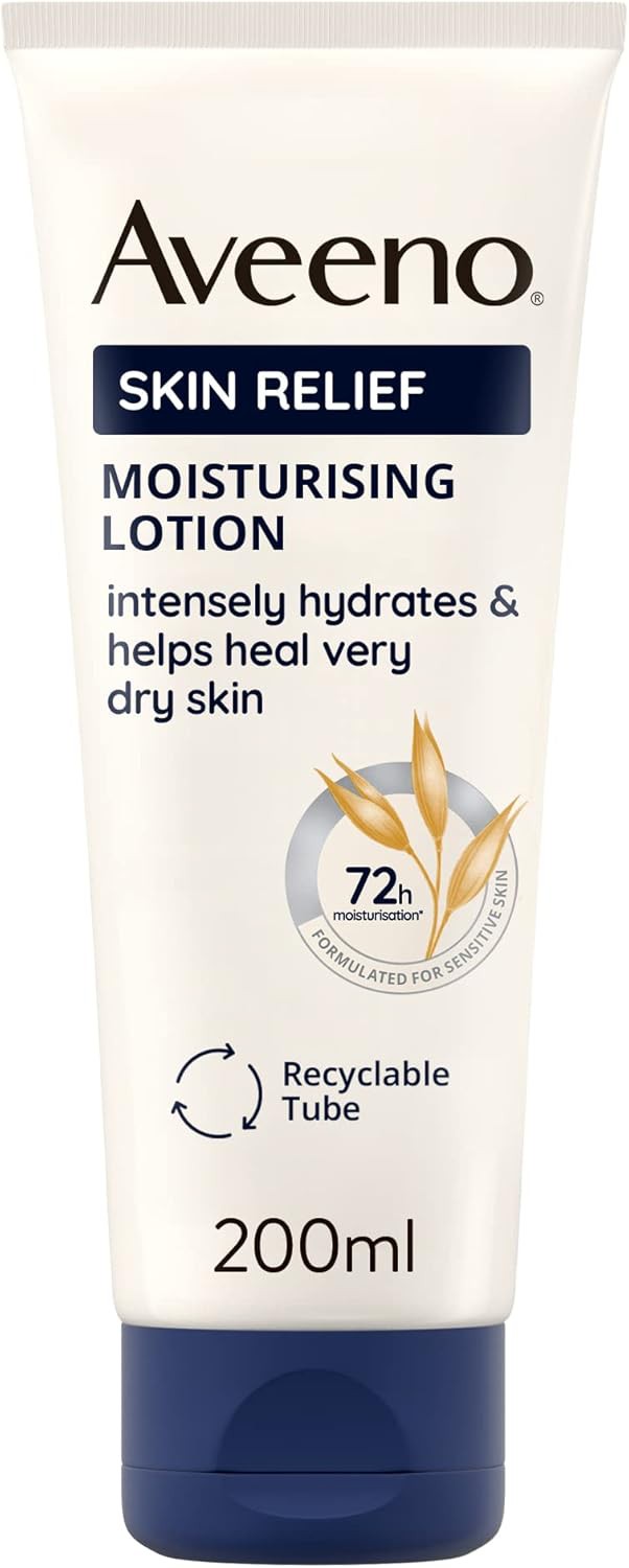 Aveeno Skin Moisturising Lotion is clinically proven to intensely hydrate for 72 hours and helps to heal very dry and itchy skin. Expertly formulated with soothing Triple Oat Complex (Oat Extract, Oat Flour, and Oat Oil) and Shea Butter to strengthen the protective skin's natural barrier to help protect the skin against external aggressors, supporting the skin's natural ceramide production. With an unscented, hypoallergenic and vegan formula, this moisturiser is suitable for use on dry and sensitive skin. It is also non-greasy and fast absorbing. This moisturiser is formulated to minimise the risk of allergies and does not contain animal-derived ingredients