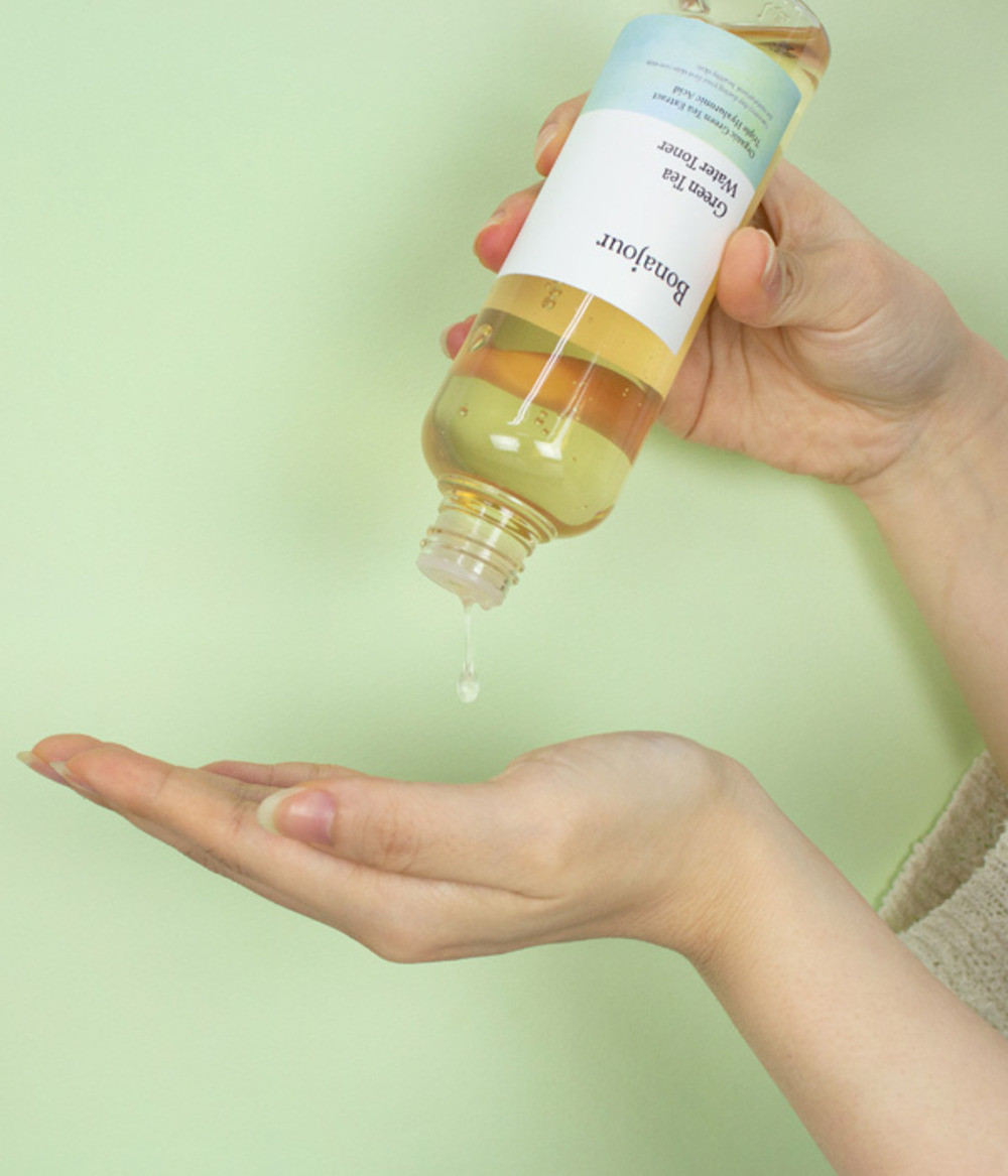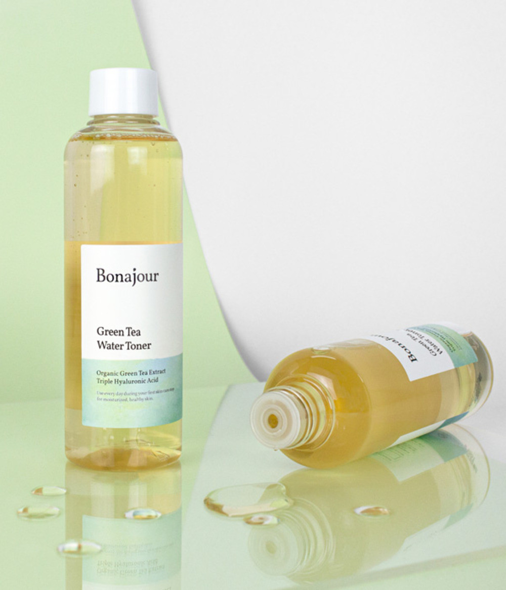 The Bonajour Green Tea Water Bomb Toner is a triple-layer hyaluronic acid hydrating toner with six types of peptides that protect the skin. It absorbs into the skin , creating moisturized skin without stickiness.