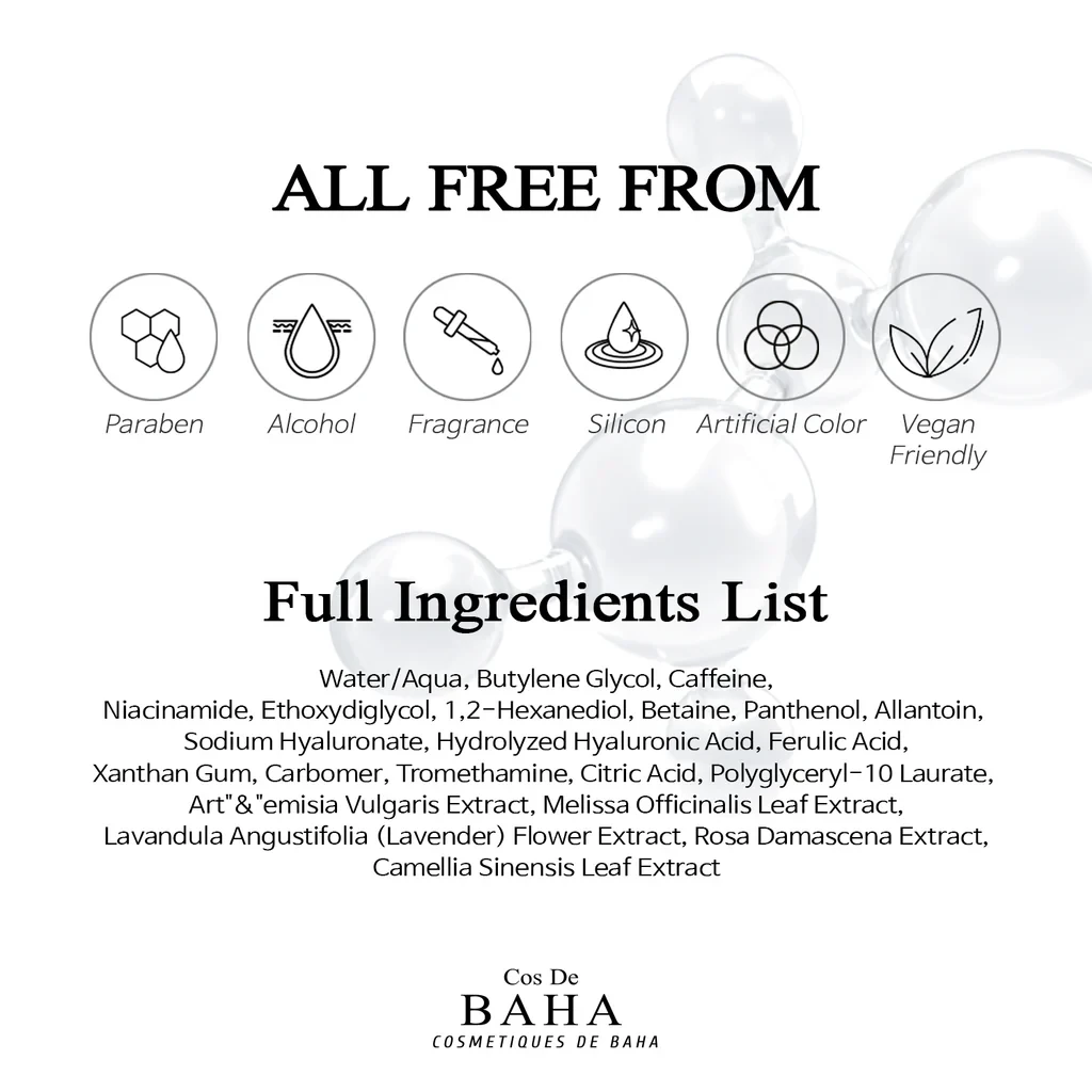 Water/Aqua, Butylene Glycol, Caffeine, Niacinamide, Ethoxydiglycol, 1,2-Hexanediol, Betaine, Panthenol, Allantoin, Sodium Hyaluronate, Hydrolyzed Hyaluronic Acid, Ferulic Acid, Xanthan Gum, Carbomer, Tromethamine, Citric Acid, Polyglyceryl-10 Laurate, Artemisia Vulgaris Extract, Melissa Officinalis Leaf Extract, Lavandula Angustifolia (Lavender) Flower Extract, Rosa Damascena Extract, Camellia Sinensis Leaf Extract.