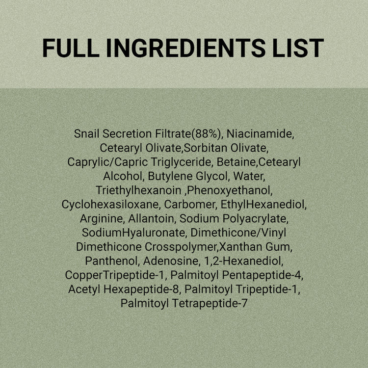Snail Secretion Filtrate(88%), Niacinamide, Cetearyl Olivate, Sorbitan Olivate, Caprylic/Capric Triglyceride, Betaine, Cetearyl Alcohol, Butylene Glycol, Water, Triethylhexanoin, Phenoxyethanol, Cyclohexasiloxane, Carbomer, Ethyl Hexanediol, Arginine, Allantoin, Sodium Polyacrylate, Sodium Hyaluronate, Dimethicone/Vinyl Dimethicone Crosspolymer, Xanthan Gum, Panthenol, Adenosine, 1,2-Hexanediol, Copper Tripeptide-1, Palmitoyl Pentapeptide-4, Acetyl Hexapeptide-8, Palmitoyl Tripeptide-1, Palmitoyl Tetrapeptide-7