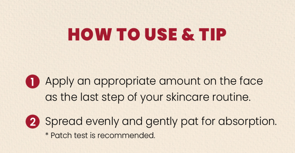 Apply an appropriate amount on the face as the last step of your skincare routine.Spread evenly and gently pat for absorption.Patch test is recommended.