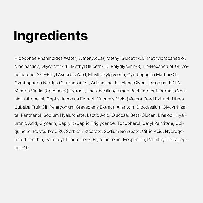 Hippophae Rhamnoides Water, Water(Aqua), Methyl Gluceth-20, Methylpropanediol, Niacinamide, Glycereth-26, Methyl Gluceth-10, Polyglycerin-3, 1,2-Hexanediol, Gluconolactone, 3-O-Ethyl Ascorbic Acid, Ethylhexylglycerin, Cymbopogon Martini Oil , Cymbopogon Nardus (Citronella) Oil , Adenosine, Butylene Glycol, Disodium EDTA, Mentha Viridis (Spearmint) Extract , Lactobacillus/Lemon Peel Ferment Extract, Geraniol, Citronellol, Coptis Japonica Extract, Cucumis Melo (Melon) Seed Extract, Litsea Cubeba Fruit Oil, Pelargonium Graveolens Extract, Allantoin, Dipotassium Glycyrrhizate, Panthenol, Sodium Hyaluronate, Lactic Acid, Glucose, Beta-Glucan, Linalool, Hyaluronic Acid, Glycerin, Caprylic/Capric Triglyceride, Tocopherol, Cetyl Palmitate, Ubiquinone, Polysorbate 80, Sorbitan Stearate, Sodium Benzoate, Citric Acid, Hydrogenated Lecithin, Palmitoyl Tripeptide-5, Ergothioneine, Hesperidin, Palmitoyl Tetrapeptide-10