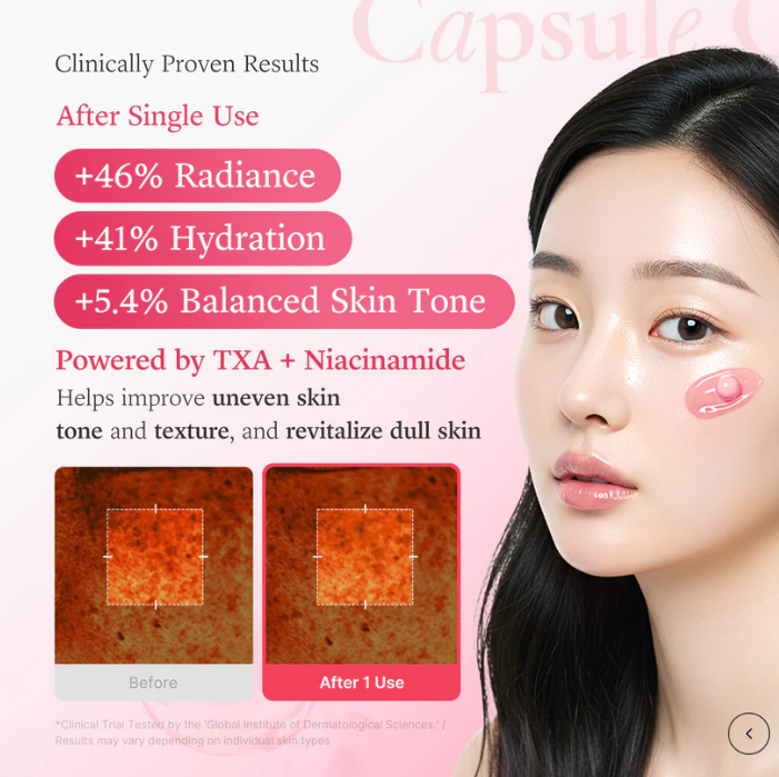 Pop! And Erase! Refines uneven tone and texture for visibly clearer, radiant skin Lightweight & Customizable Capsule Cream with TXA, A gentle yet effective ingredients for improving uneven skin tone with low irritation The TXA Niacinamide Capsule Cream has undergone human application testing and has been determined to be low-irritating (0.00%). Also it has been confirmed suitable for acne-prone skin and sensitive skin