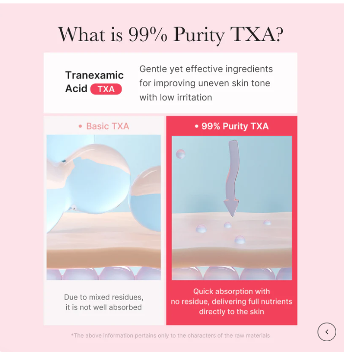 A gentle yet effective ingredients for dark spot, acne scars, and hyperpigmentation care with low irritation 99% Purity for quick absorption with no residue, delivering full nutrients directly to the skin