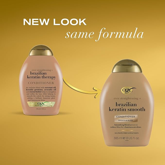 Smooth hair the way nature intended with OGX® Ever-Straightening + Brazilian Keratin Therapy Conditioner. No matter the hair type, this powerhouse hair-smoothing conditioner nourishes & hydrates strands, leaving them extra-glossy with a lustrous shine. The rich & exclusive blend of this conditioner contains Brazilian keratin protein, which is known to help strengthen & smooth hair. The straightening conditioner is also infused with coconut oil for softness, avocado oil for moisture, & cocoa butter. Plus, the coconut, brazil nut & cocoa butter scent makes conditioning an all-around sensory experience that leaves locks with an irresistibly good smell. Paraben-free with sulfate-free surfactants, this nourishing conditioner is gentle enough to smooth hair cuticles & promote strong, long tresses. For a full hair care routine that’ll leave your hair with a brilliant, luxurious glow, pair this keratin conditioner with OGX® Ever-Straightening + Brazilian Keratin Therapy Shampoo.